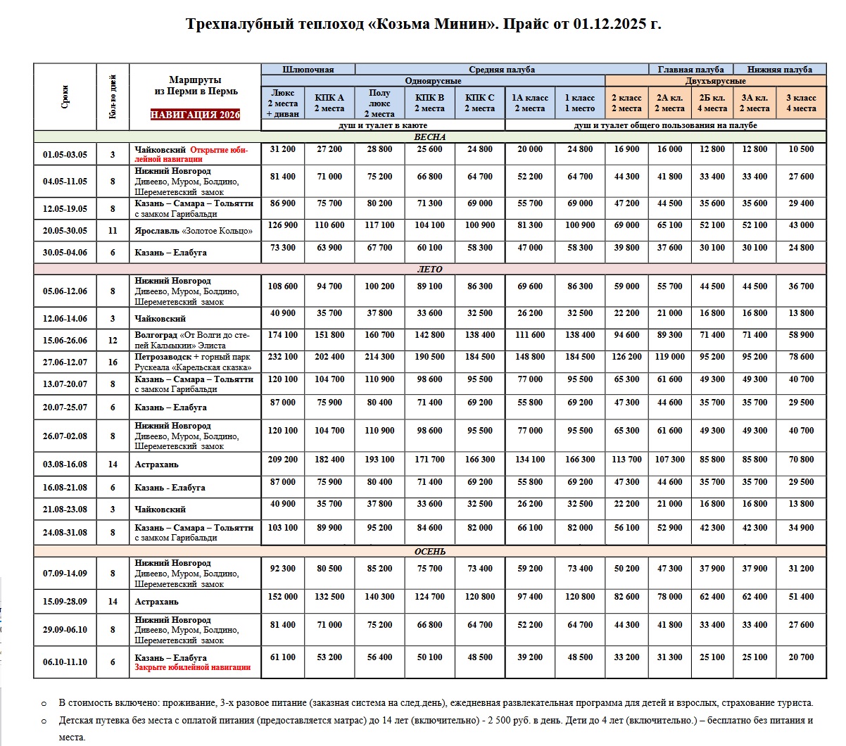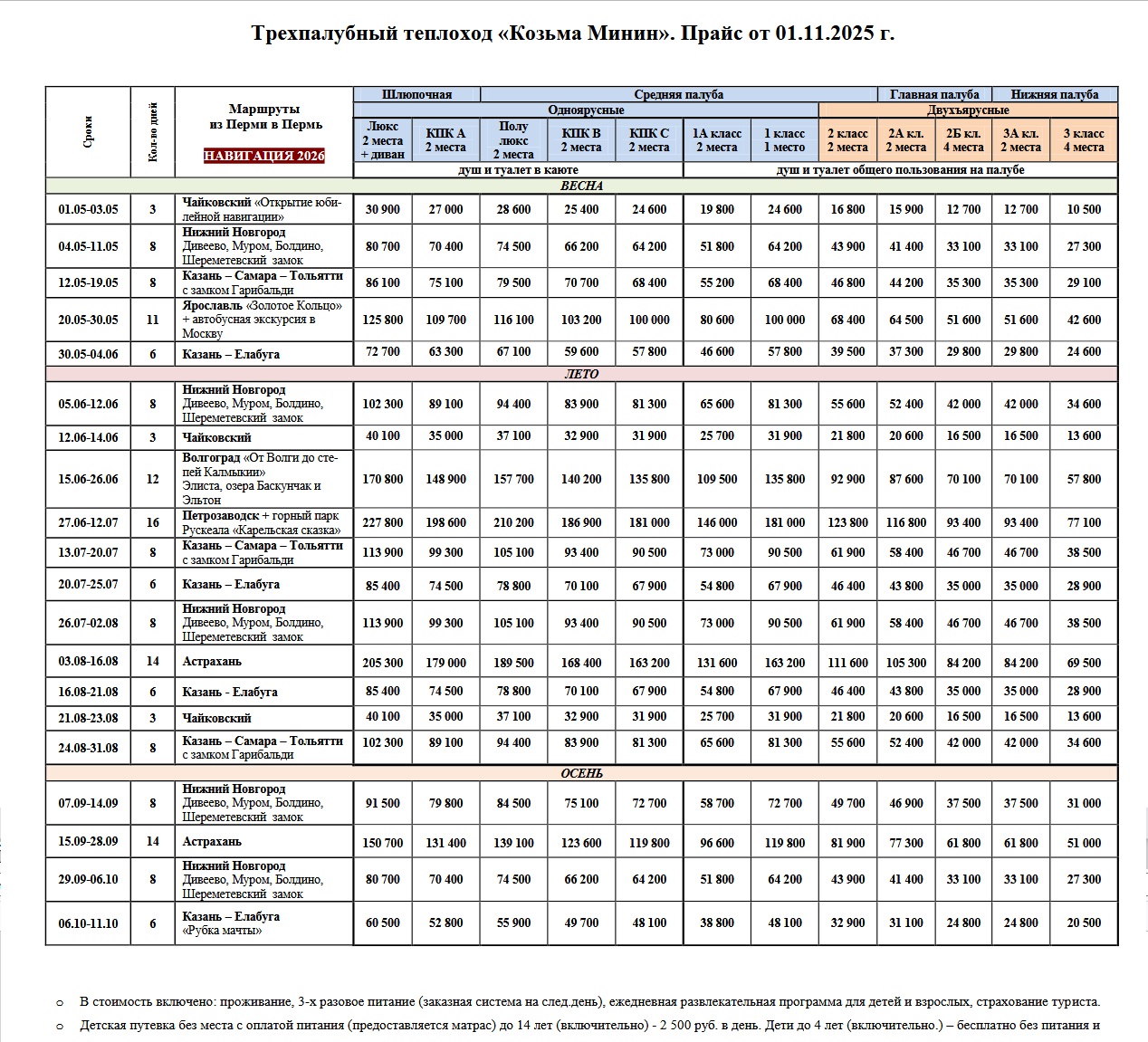 В 2026 году теплоход "Козьма Минин" отправится по многим маршрутам из Перми. Предусмотрены варианты маршрутов с посадкой/высадкой в городах Казань,Ярославль (Золотое кольцо), Елабуга, Чайковский, Челябинск, Нижний Новгород, Чебоксары, Волгоград, Ярославль, Астрахань. Вы можете отправиться в долгосрочную поездку на 14 дней в Астрахань-Волгоград или в тур выходного дня — таких вариантов также немало. В самом продолжительном 14-дневном круизе вы посетите Елабугу, Казань, Астрахань и Волгоград, в круизах до Казани и Елабуги вам будут предложены экскурсии в Йошкар-Олу и Чебоксары, также представлены классические круизы до Волгограда и Астрахани, а круиз до Астрахани расширен набирающим популярность маршрутом в Дельту Волги. И конечно же вы сможете поближе познакомиться с красотами родного Пермского края в круизах до Чайковского.