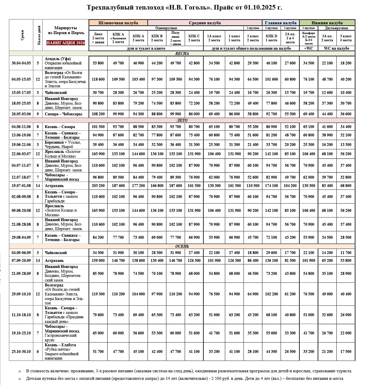 Сезон длится с мая по октябрь. Расписание теплохода «Н.В.Гоголь» в 2026 году предусматривает 16 программ, которые отличаются маршрутом следования и продолжительностью поездки. Чтобы отдохнуть от рабочих будней, вы можете заказать тур на 3 дня и посетить в рамках него Чайковский и Сарапул. Если же вы строите планы на отпуск, выбирайте одну из долгосрочных программ.Отправляясь из Перми, теплоход «Гоголь» следует в Санкт-Петербург (Кижи, Валаам), Ярославль, Самару, Саратов, Чебоксары (Йошкар-Ола), Нижний Новгород, Волгоград, Ярославль (Золотое кольцо) и другие города, расположенные по течению рек Кама, Волга, Нева.